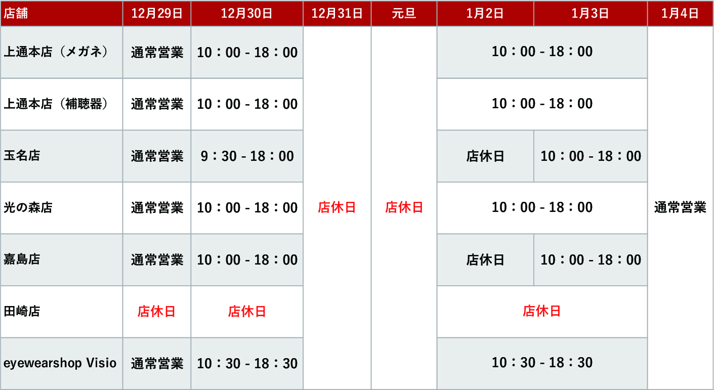 お知らせ (2023-2024)年末年始の営業時間のご案内 2023年12月07日/全店舗 日頃より大宝堂をご利用いただきまして、誠にありがとうございます。 大宝堂各店の年末年始の営業についてご案内いたします。 通常の営業とは異なりますのでご不便をおかけ致しますが、何卒ご理解の程よろしくお願い申し上げます。 店舗情報は こちらをご覧ください。 Category 全店舗 上通本店 健軍店 玉名店 光の森店 嘉島店 補聴器 旧ブログ記事 NEWS Visio ブログ レンズ 修理・メンテナンス 田崎店 Archive 2026 2025 2024 2023 2022 2021 2020 2019 2018 2017 2016 2015
