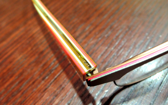 8層もの生地を貼りあわせ、表面の削る量を変化させることで見えるカラーを変えています。