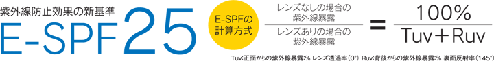 E-SPF®は、メガネレンズの総合的な紫外線防止効果の優位性を示す世界的な指標です。E-SPF®は、エシロール・インターナショナルが開発し、第三者機関の認証を受けています。E-SPF25®と標記されたレンズは、何も対策をしていない場合と比べると、目が浴びる紫外線をレンズが防ぎ、その差が25倍あることを示しています。