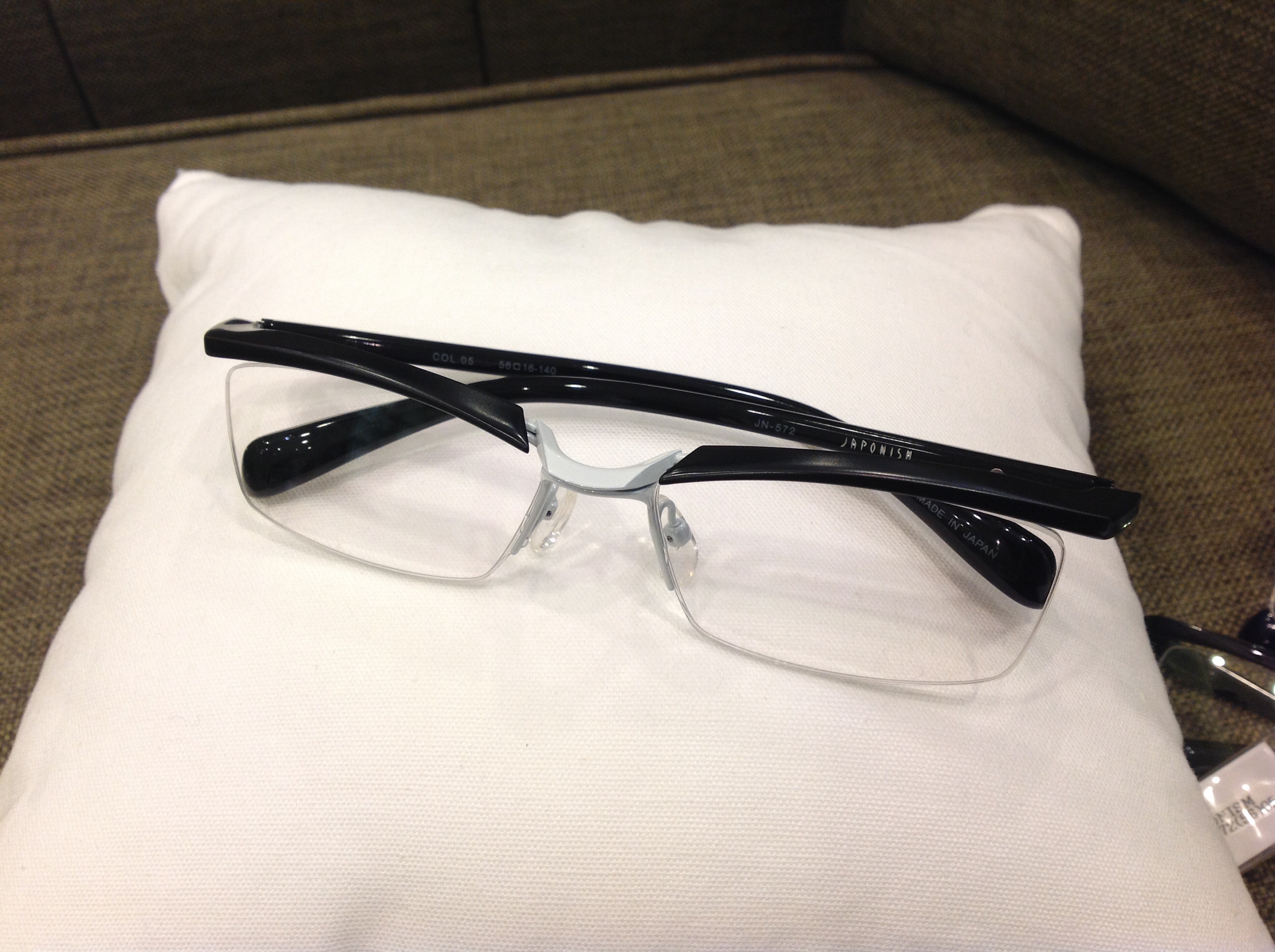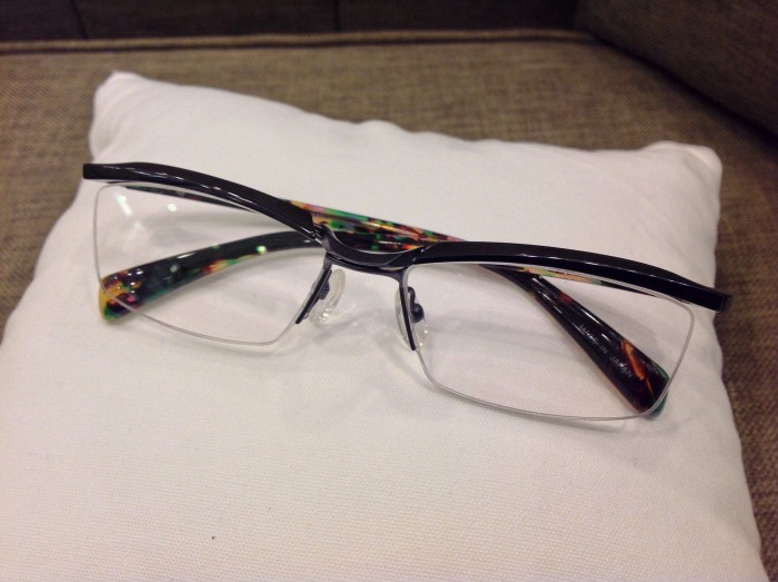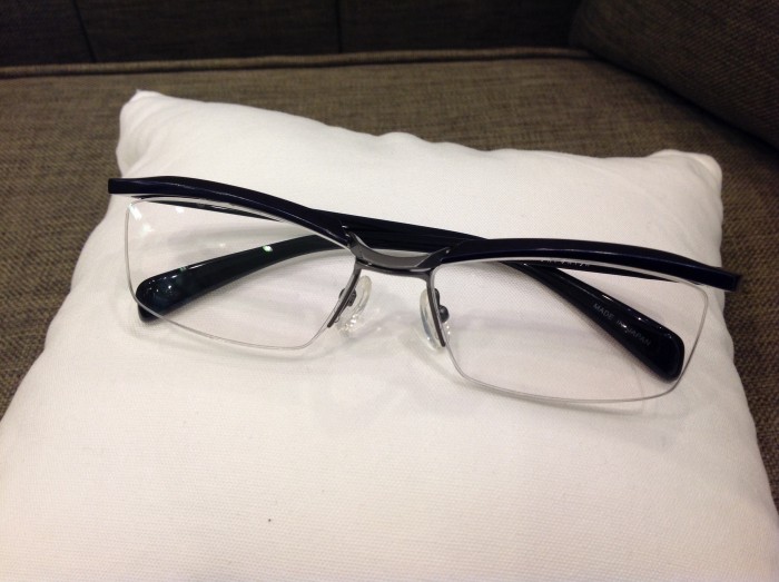 メガネの前面に設けたブローパーツの内に潜むチタンが柔軟な動きで外へ可動をするんです。