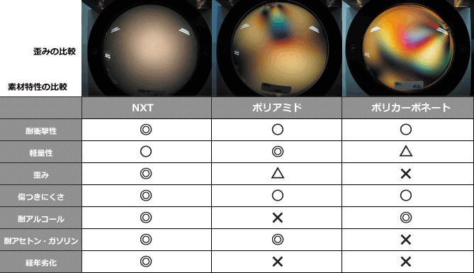 下の表が各素材(NXT/ポリアミド/ポリカーボネート)での特性比較です